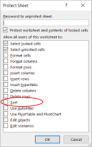 When you ‘Protect’ a sheet in Excel, there’s a list of things you can ‘allow’ users to do while the sheet is protected.