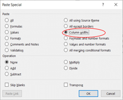 In the Paste Special menu, we get the option to paste ‘Column Widths’ but NOT ‘Row Heights’.