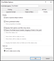 • Split Client & Descriptions into separate columns: Right-click on Pivot Table, choose Pivot Table Options; in Display tab, check the box ‘Classic Pivot Table layout’: