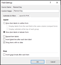 • Set Columns to always appear: Left click on field in ‘Columns’ box, select ‘Field Settings’; in Layout & Print tab, check box ‘Show items with no data’: