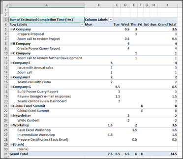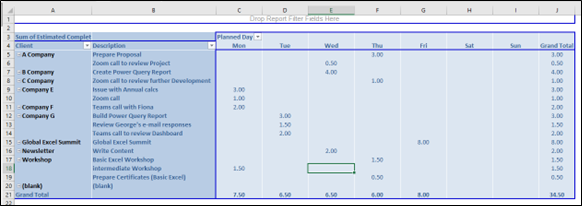 All I now need to do is continue entering new tasks into the datasheets, amend the dates of existing tasks, or mark them as complete. Then, when I refresh this Pivot Table, all the information from the datasheet will appear here.