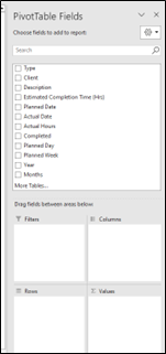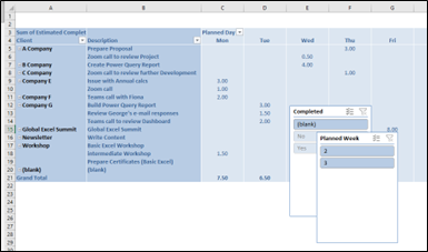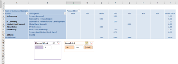 Click anywhere on the Pivot Table, go to the ‘PivotTable Analyze’ toolbar, select ‘Insert Slicer’. A list of all fields will appear; select any that are relevant. I would choose ‘Planned Week’ & ‘Completed’, and they will appear as follows:
