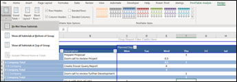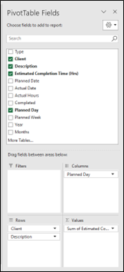 The above Pivot Table is looking great; however, it is currently showing ALL of the tasks from the datasheet, and we need to be able to narrow this down to a specific week, and also exclude any tasks that are completed.