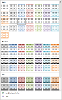 Select ‘Design’ and select from the many Pivot Table Styles: