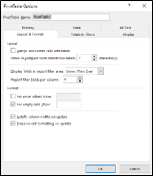 3. You will also need to stop the Pivot Table automatically adjusting the column widths: Right-click on Pivot Table, choose Pivot Table Options; in Layout & Format tab, uncheck the box ‘Autofit column widths on update’.