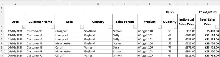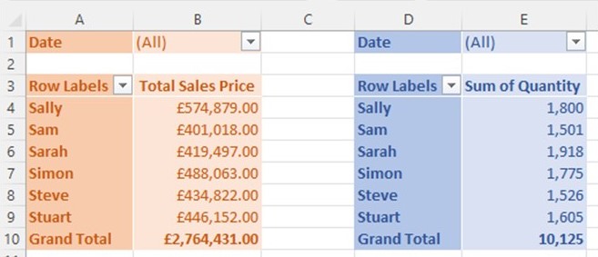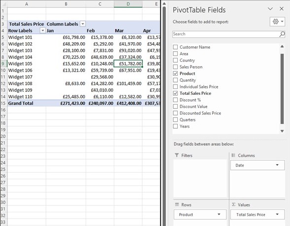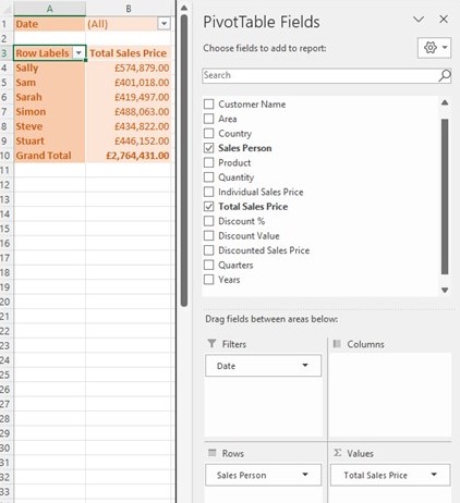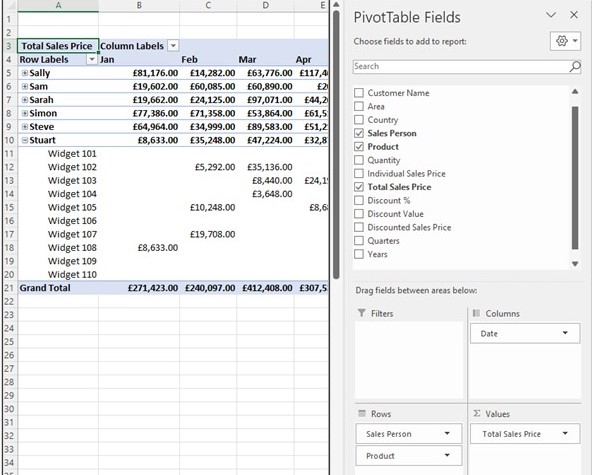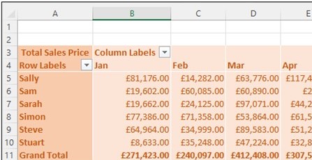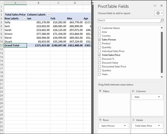 In the example above, you’ll see that the ‘Product’ field has been swapped in the rows area for the ‘Sales Person.’ The report still shows the same ‘Grand Total,’ but this has now been split by Sales Person and Month instead of Product.