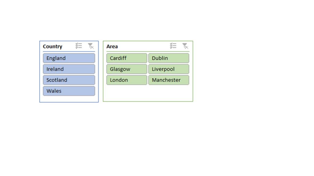 As England has been selected in the Country Slicer, you can see that three of the areas have been greyed out in the Area Slicer, and the relevant areas have been sorted into alphabetical order to make selection easier. This is far simpler to use than filters in the Pivot Table, as you can see the correlation between selections.
